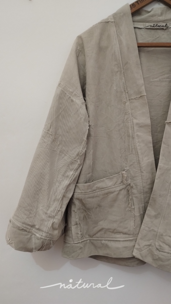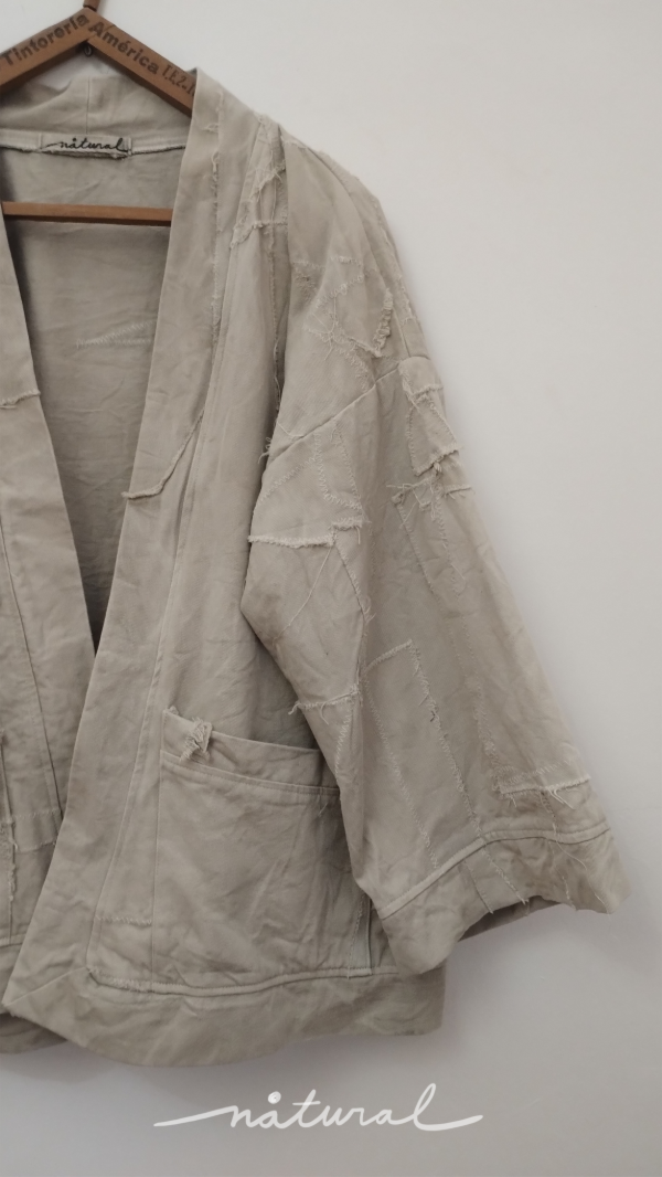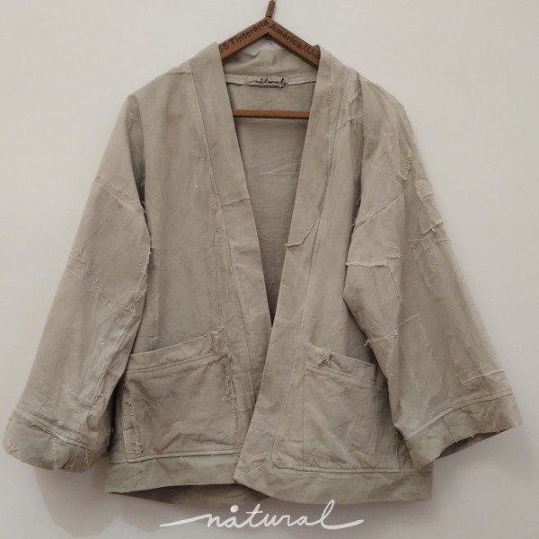 Kimono de gabardina hecho a partir de retazos de gabardina cruda, unidos a máquina con puntada zig zag, formando un patrón único e irrepetible. Luego está teñido con Yerba Mate.