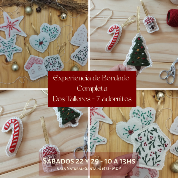 Esta propuesta reúne los dos talleres presenciales de bordado navideño en Casa Natural, para que vivas una experiencia creativa completa y te lleves una colección de adornos hechos por vos, llenos de textura, color y espíritu festivo. Además, incluye un kit de bordado de regalo 🤶🏼