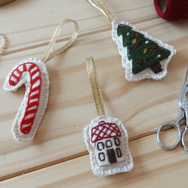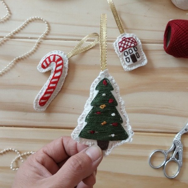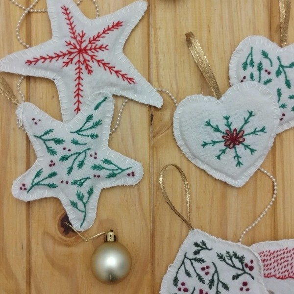 🧵 En el primer encuentro vas a bordar 4 adornos de tela con formas clásicas: un corazón, una casita, un pinito y una estrella.